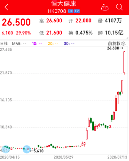 港股市场上,恒大健康昨日大涨近30%。6月10日,恒大健康公告斥资3.795亿美元(约合人民币26.57亿元)收购瑞典国家电动汽车(NEVS)17.6%股权,NEVS将成为恒大100%控股的子公司。消息发布后,公司股价开启狂奔模式,6月11日以来的短短一个月,公司股价累计上涨超300%,总市值飙升至2290亿港元。截至目前,恒大健康的第一款新能源汽车“恒驰1”尚未亮相,官方预计的量产时间将在2021年。