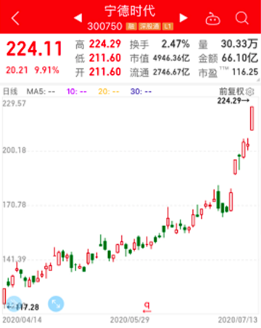 创业板“一哥”宁德时代昨日大涨9.91%,市值逼近5000亿元。消息面上,7月10日宁德时代发布公告:日本车企本田将参与宁德时代非公开发行股票的认购,认购股份数量约占本次非公开发行股份后总股本的1%,并将持有股票5年以上。此外,根据公司2月份公告,宁德时代本月起向特斯拉(上海)有限公司提供锂离子动力电池,拟供货有效期限为2020年7月1日至2022年6月30日。