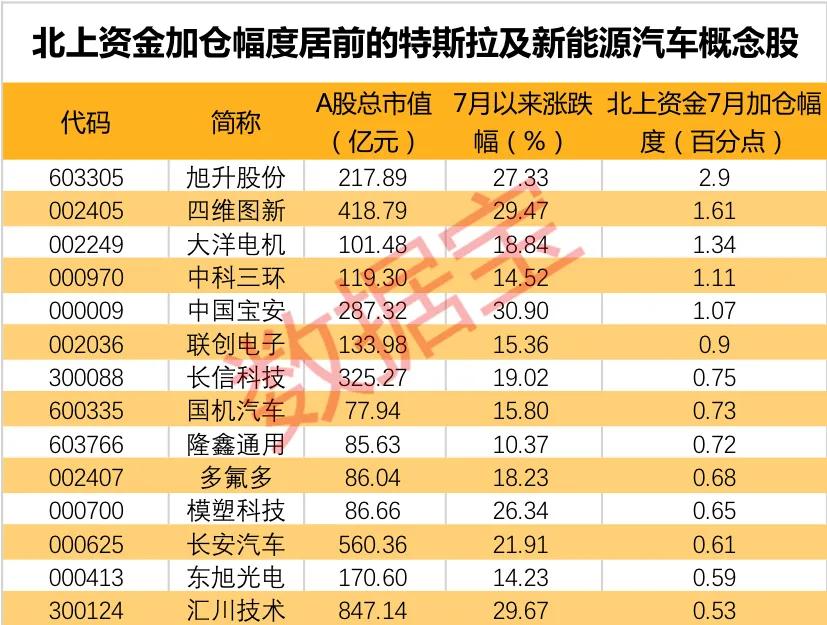 证券时报·数据宝统计,7月以来北上资金加仓幅度超过0.5个百分点的特斯拉概念股和新能源汽车概念股共有14只。其中,旭升股份获北上资金加仓2.9个百分点,外资流入力度最大,四维图新、大洋电机、中科三环和中国宝安均获北上资金加仓超1个百分点。