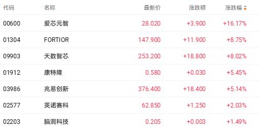 今日港股芯片板块表现活跃。截至发稿,爱芯元智(02513.HK)涨16.17%、天数智芯(09903.HK)涨8.02%、兆易创新(03986.HK)涨5.14%。