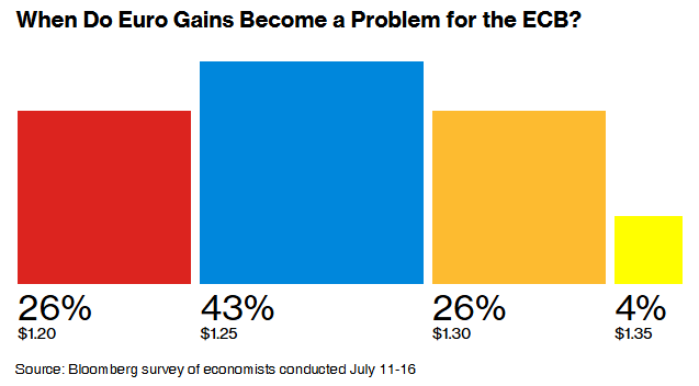 但调查受访者似乎容忍度更高。只有约四分之一人认同Luis de Guindos的观点,其余人认为欧元兑美元汇率升至1.35才会成为问题。许多受访者表示,升值的速度与幅度同样重要、甚至更重要,是判断对价格下行风险的关键因素。