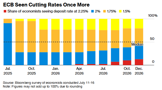 一项对经济学家的调查显示,欧洲央行可能会将最后一次降息推迟至12月,而不会让投资者认为宽松周期已经结束。调查显示,多数受访者仍预计,欧洲央行将在下周的政策会议上按兵不动,然后在9月进行最后一次25个基点的降息,将存款机制利率下调至1.75%。与此同时,半数受访者预计,欧洲央行可能会连续三次会议(即7月、8月、9月)选择维持利率不变而不会让市场认为利率已经触底,这一期限比此前更长主要是因为贸易方面的不确定性。