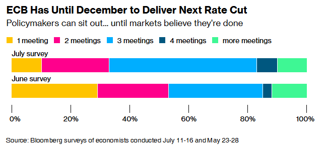调查显示,约四分之一的受访者认为,欧洲央行已经完成降息。近一半受访者预测最后一次降息将在9月,另有21%预计会在12月进行。