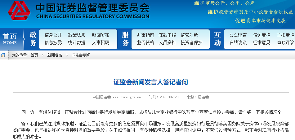 28日晚间,证监会新闻发言人就此回应称,“证监会目前没有更多的信息需要向市场通报。发展高质量投资银行是贯彻落实国务院关于资本市场发展决策部署的需要,也是推进和扩大直接融资的重要手段。关于如何推进,有多种路径选择,现尚在讨论中。不管通过何种方式,都不会对现有行业格局形成大的冲击。”
