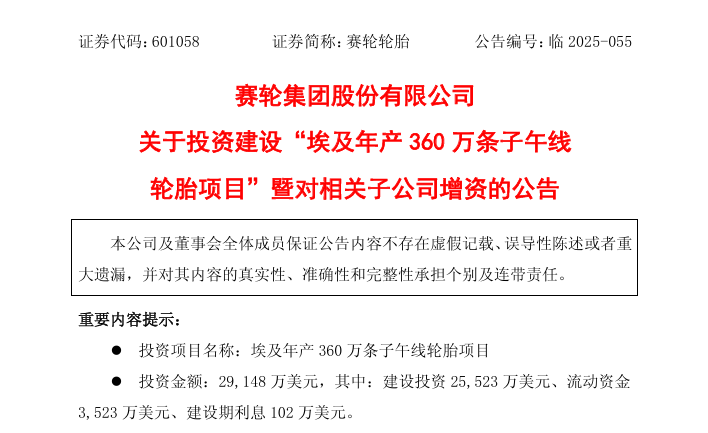 作为国内首家海外建厂的轮胎企业,赛轮集团8月15日发布公告称,将在埃及投资2.91亿美元建设“年产360万条子午线轮胎项目”,项目建设期18个月。公司预计投资回收期6.15年,定位于埃及本地及周边市场。