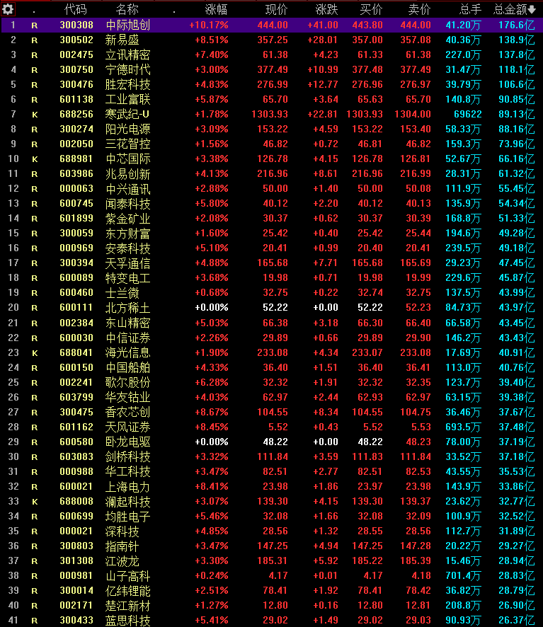 二是A股出现罕见一幕。今天上午,A股成交额榜前50的个股中,仅有先导智能一只个股微跌0.04%,其余个股无一下跌。中际旭创、新易盛、立讯精密成交额居前三位。