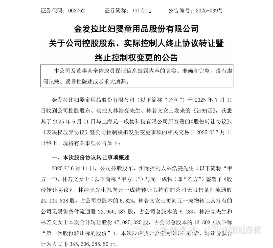 7月11日晚,*ST金比发布公告称,公司控股股东、实际控制人林浩亮、林若文与上海元一成物科技有限公司(下称“元一成物”)签署的《股份转让协议》及《表决权放弃协议》正式终止。