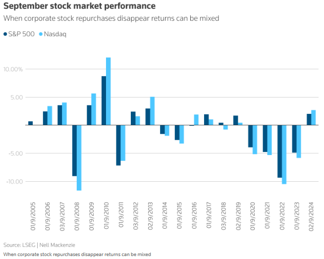 过去20年间,美国股市有近半数年份在九月录得负收益。此外,出于监管原因,企业在九月不得进行股票回购操作(进一步削弱市场支撑力)。