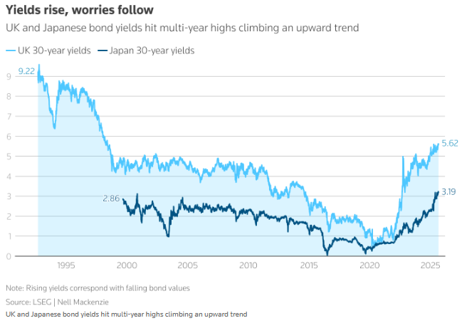 “观察英国30年期国债与日本国债(JGBs)的收益率数据便会发现,它们正处于新高水平——而任一市场爆发危机,都可能引发另一市场的连锁危机。”