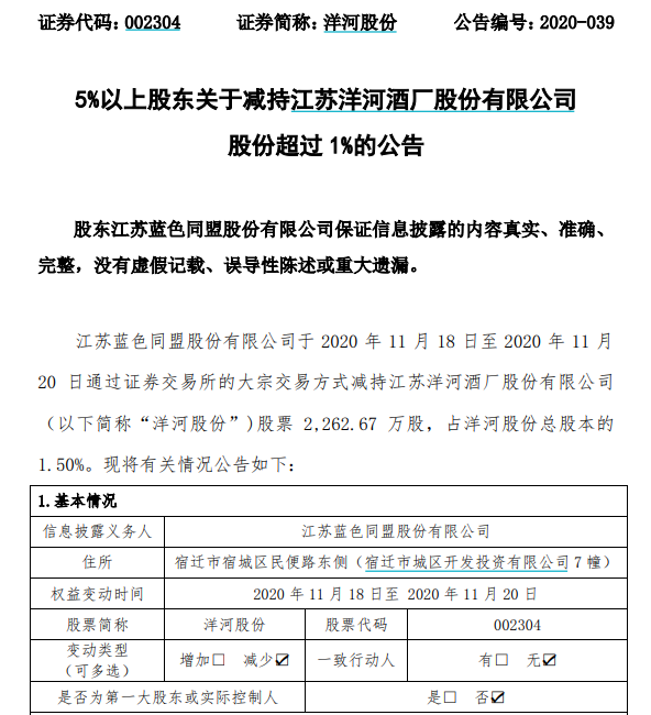 无独有偶,白酒公司洋河股份(002304)同日也发布了一份减持公告,大股东江苏蓝色同盟股份有限公司(下称蓝色同盟)于2020年11月18日至2020年11月20日通过证券交易所的大宗交易方式减持公司股份2262.67万股,占洋河股份总股本的1.5%。