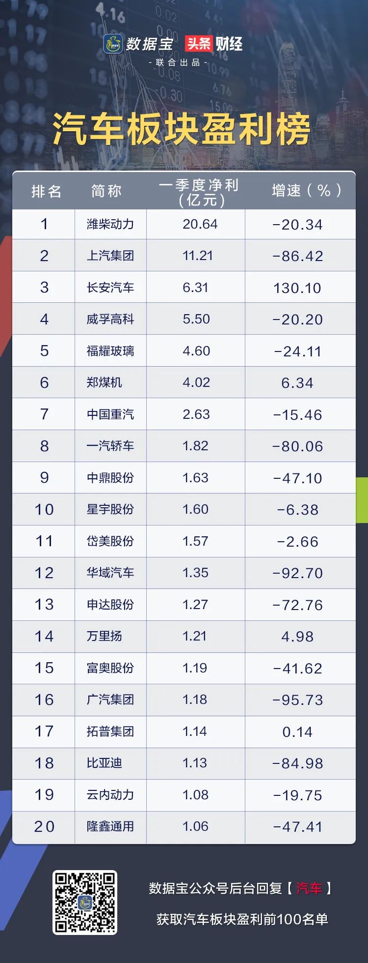 长安汽车一季度盈利6.31亿元,同比扭亏为盈,排名第三,是汽车行业在一季度为数不多表现极好的上市公司。长安汽车在2019年的业绩表现并不好,净利润暴跌近500%,是上市23年来的首亏。不过2019年下半年,公司深度的转型策略开始迎来收获期,全球研发中心、蓝鲸动力等一系列成果的落地,在产品上换代升级,其中不乏爆款。去年第四季度公司基本实现盈亏平衡,今年一季度虽然有疫情影响但依然成功实现盈利。