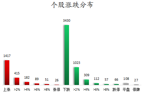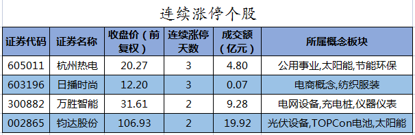 截至收盘,沪深两市合计1417只个股上涨,3430只个股下跌,平盘个股108只,停牌的个股27只。不含当日上市新股,共有26只个股涨停,66只个股跌停。连续涨停天数看,日播时尚、杭州热电均已连收3个涨停板,连续涨停板数量最多。