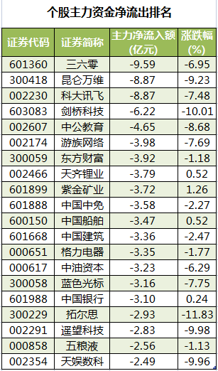 此外,3093只个股被主力资金净卖出,其中,78股被主力资金净卖出超1亿元。主力资金净流出最多的个股是三六零,净流出金额为9.59亿元;主力资金净流出居前的个股还有昆仑万维、科大讯飞、剑桥科技、中公教育、游族网络,净流出金额分别为8.87亿元、8.87亿元、6.22亿元、4.65亿元、3.98亿元。