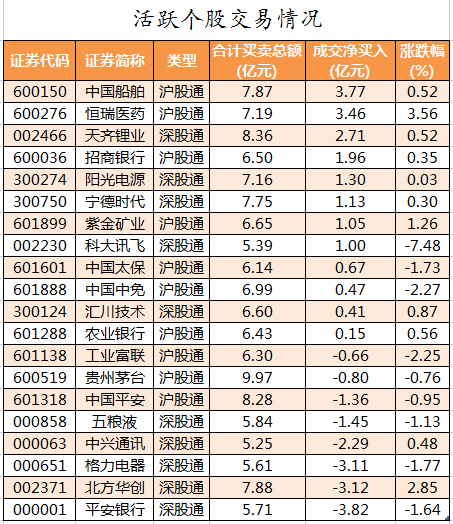 活跃个股方面,北向资金今日净买入较多的有中国船舶、恒瑞医药、天齐锂业、招商银行、阳光电源,净买入金额分别为3.77亿元、3.46亿元、2.71亿元、1.96亿元、1.3亿元。北向资金净卖出较多的有平安银行、北方华创、格力电器、中兴通讯、五粮液,净卖出金额分别为3.82亿元、3.12亿元、3.11亿元、2.29亿元、1.45亿元。
