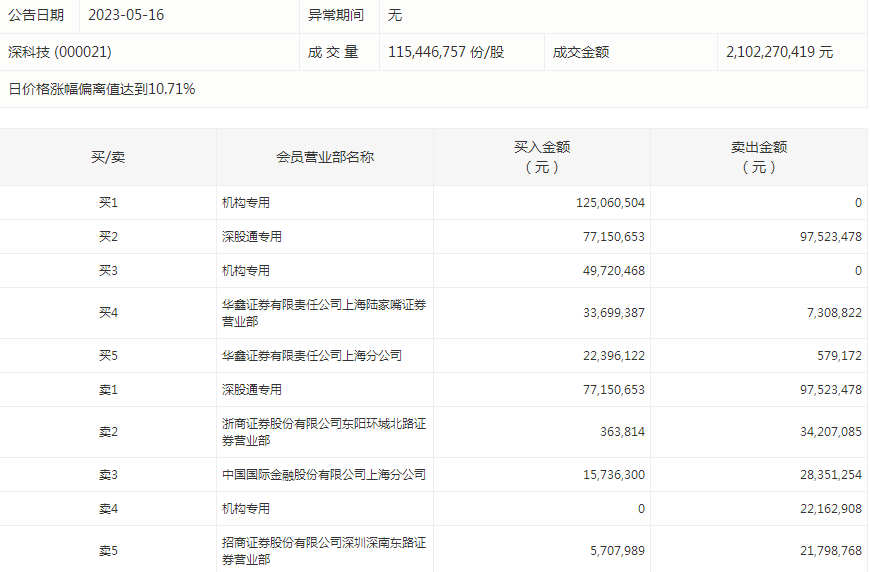 深科技今天涨停。盘后数据显示,3个机构出现在龙虎榜单上,合计净买入约1.53亿元;华鑫证券有限责任公司上海陆家嘴证券营业部买入3369.94万元,同时卖出730.88万元;中国国际金融股份有限公司上海分公司买入1573.63万元,同时卖出2835.13万元。