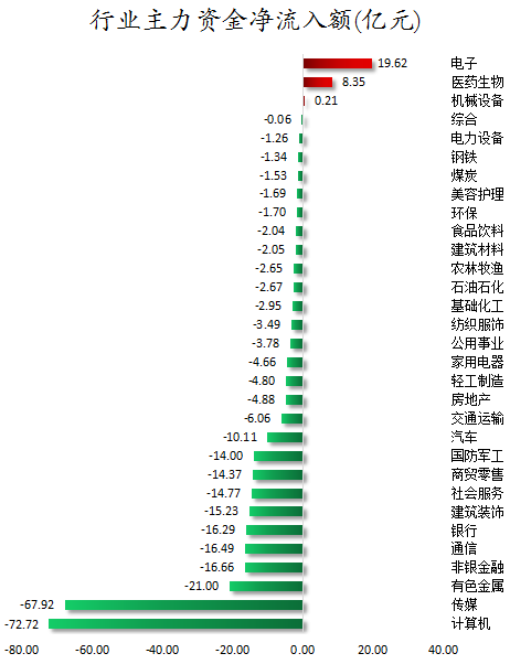 从行业板块来看,申万所属的31个一级行业,今日仅有电子、医药生物、机械设备3个行业板块主力资金呈现净流入,净流入金额分别为19.62亿元、8.35亿元、0.21亿元。28个行业板块主力资金呈现净流出,其中,计算机行业板块主力资金净流出最多,净流出金额为72.72亿元;行业板块主力资金净流出靠前的还有传媒、有色金属、非银金融、通信、银行、建筑装饰,净流出金额分别为67.92亿元、21亿元、16.66亿元、16.49亿元、16.29亿元、15.23亿元。