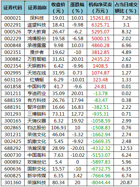 盘后龙虎榜数据显示,今日机构席位资金合计净买入约682.6万元。其中,净买入的个股11只,净卖出的个股14只。机构净买入最多的股票是深科技,净买入金额约1.53亿元;机构净买入居前的还有遥望科技、学大教育、鸿博股份、承德露露、万胜智能等股。机构净卖出最多的股票是荣旗科技,净卖出金额约8044.44万元;机构净卖出居前的还有新华传媒、国新文化、欢瑞世纪等股。