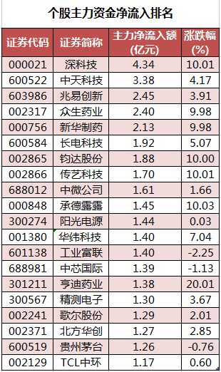 个股来看,今日有1834只个股获主力资金净流入,其中,24股获主力资金净流入超1亿元。深科技获主力资金净流入最多,净流入金额为4.34亿元;主力资金净流入居前的个股还有中天科技、兆易创新、众生药业、新华制药、长电科技,净流入金额分别为3.38亿元、2.45亿元、2.4亿元、2.13亿元、1.92亿元。