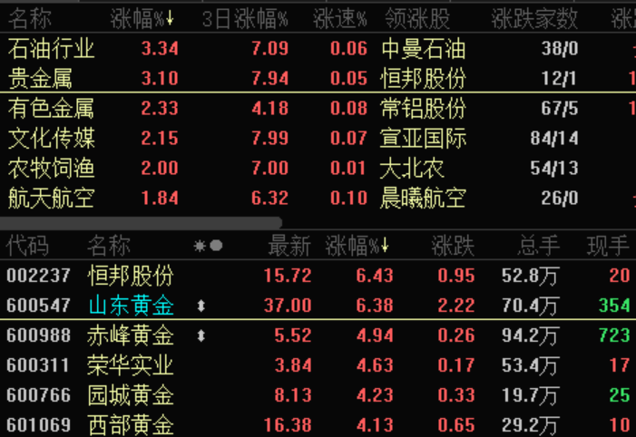 A股市场上有色金属、石油石化板块同样领涨大盘。早盘除中曼石油涨停外,贝肯能源上午收盘报涨9.24%,中海油服涨超8%,中国石油一度涨逾5%。黄金珠宝概念板块中,早盘爱迪尔封死涨停,银泰黄金涨7.62%,山东黄金、恒邦股份均涨逾6%。
