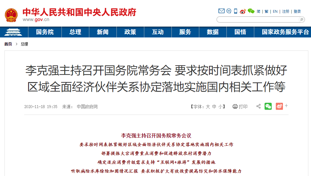 国务院总理李克强11月18日主持召开国务院常务会议,要求按时间表抓紧做好区域全面经济伙伴关系协定落地实施国内相关工作;部署提振大宗消费重点消费和促进释放农村消费潜力;确定适应消费升级支持“互联网++旅游”的措施;听取病险水库除险加固情况汇报,要求积极扩大有效投资,提高防灾和供水保障能力。
