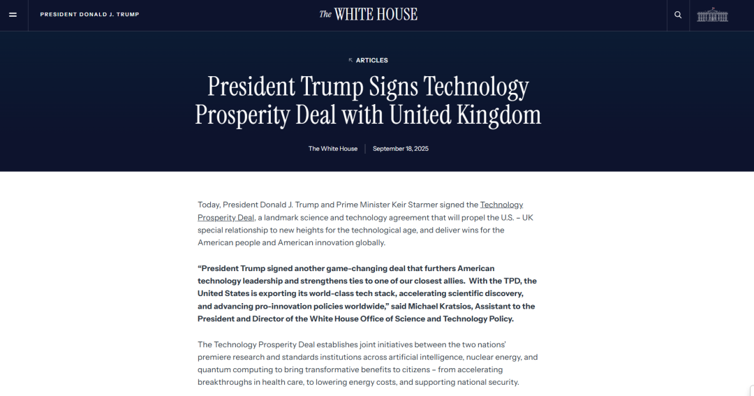 特朗普和斯塔默签署了一项《科技繁荣协议》,共同努力开发用于医疗保健的人工智能模型,扩大量子计算能力,简化民用核项目。