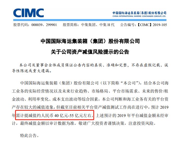 中集集团公告,公司判断和海工业务有关的平台资产存在较大的减值迹象,截至目前相关平台资产减值测试工作尚在进行中,预计2019年需计提减值约40亿元-55亿元。