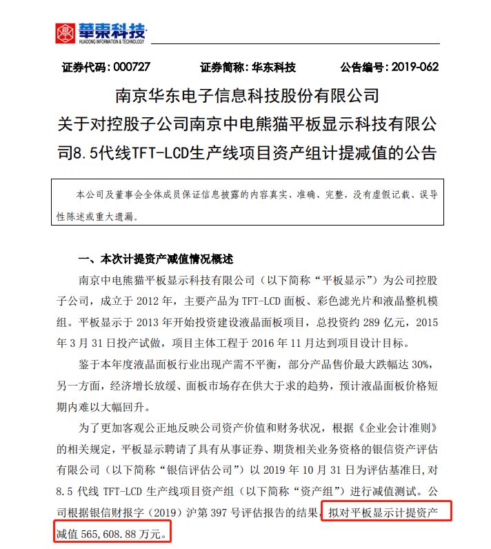 华东科技公告,鉴于本年度液晶面板行业出现产需不平衡,部分产品售价最大跌幅达30%,预计液晶面板价格短期内难以大幅回升,公司控股子公司南京中电熊猫平板显示科技公司,对8.5代线TFT-LCD生产线项目资产组进行减值测试。据此,公司拟对该子公司计提资产减值56.56亿元,预计将减少公司2019年利润总额56.56亿元,归母净利润32.6亿元。