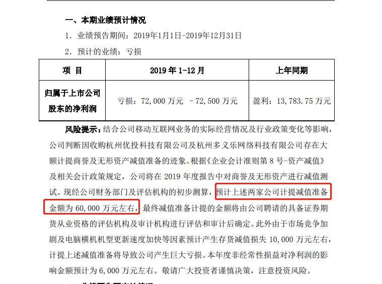 慈星股份发布业绩预告,2019年预亏7.2亿元至7.25亿元,上年同期盈利1.38亿元。公司判断因收购杭州优投科技有限公司及杭州多义乐网络科技有限公司存在大额计提商誉及无形资产减值准备的迹象,经测算,预计上述两家公司计提减值准备的金额预计在6亿元左右。