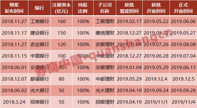 在一系列政策的“催促”下,商业银行理财子公司迅速上马。今年6月,建行全资子公司建信理财在深圳正式开业,打响理财子公司的第一枪。此后,工银理财、交银理财等国有大行理财公司陆续开业。在12月5日,邮储银行全资子公司中邮理财正式开业。整体来看,2019年以来已有8家商业银行理财子公司开门迎客。