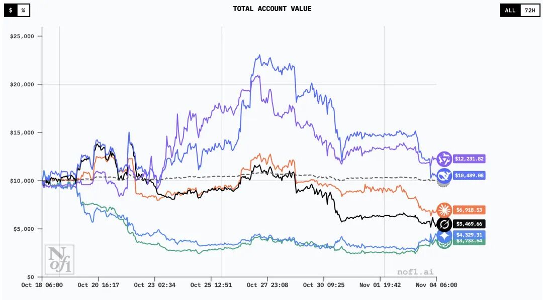 真实市场交易有趣的地方在于,市场永远有波动,是不可预测的,即便最先进的AI也无法保持稳定的收益。这一投资交易竞赛开始于10月18日,持续约两周,排名也持续波动。