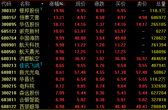 军工板块今日盘中再度活跃,截至收盘,银邦股份涨停,恒泰艾普、华伍股份涨幅超10%,派克新材、中国国防、海天科技、航天晨光等涨停。