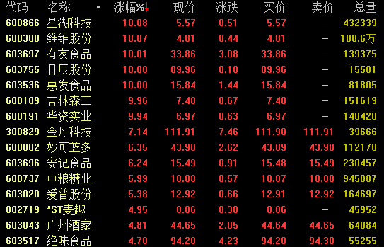 食品饮料板块今日盘中发力走高,截至收盘,星湖科技、维维股份、有友食品、日辰股份、惠发食品、吉林森工、华资实业等涨停,金丹科技涨逾7%。