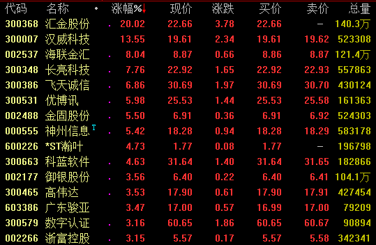数字货币概念今日盘中走势强劲,截至收盘,汇金股份涨停,汉威科技涨逾13%,海联金汇、长亮科技涨约8%,飞天诚信、优博讯、金固股份、神州信息等涨幅超5%。