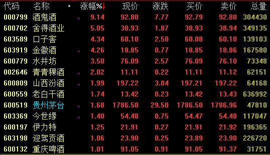 白酒板块今日盘中再度走强,截至收盘,酒鬼酒大涨逾9%,再创新高;舍得酒业涨逾5%,贵州茅台涨近2%,盘中突破1800点再创新高。此外,五粮液、泸州老窖等盘中亦创出新高。