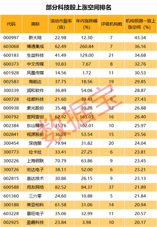 市值较大、一致目标上涨空间较大的科技股已然不多。数据显示,5家机构以上评级、最新市值在百亿元以上的科技股中,仅有22只个股一致上涨空间超过20%。其中,新大陆、博通集成、生益科技、中文传媒、凤凰传媒等一致上涨空间超过30%。