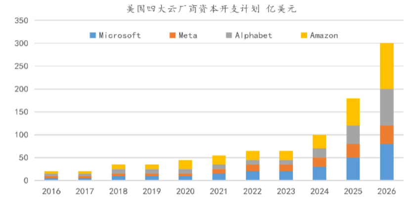随AI训练及推理需求持续增长,云端算力基础设施需求旺盛。北美市场方面,头部云厂商资本开支强劲增长并持续上调指引。2025年1月21日,美国总统宣布OpenAI、软银和甲骨文将共同投资建设的AI基础设施项目“星际之门”,计划在未来4年内投资5000亿美元。目前,该计划已确定将在美国新建5个AI数据中心,未来三年内投资将超过4000亿美元,最终目标是实现近7千兆瓦的算力容量。2025年北美四大云厂商资本开支同比高增,预计2026年延续AI基建投资的高景气。