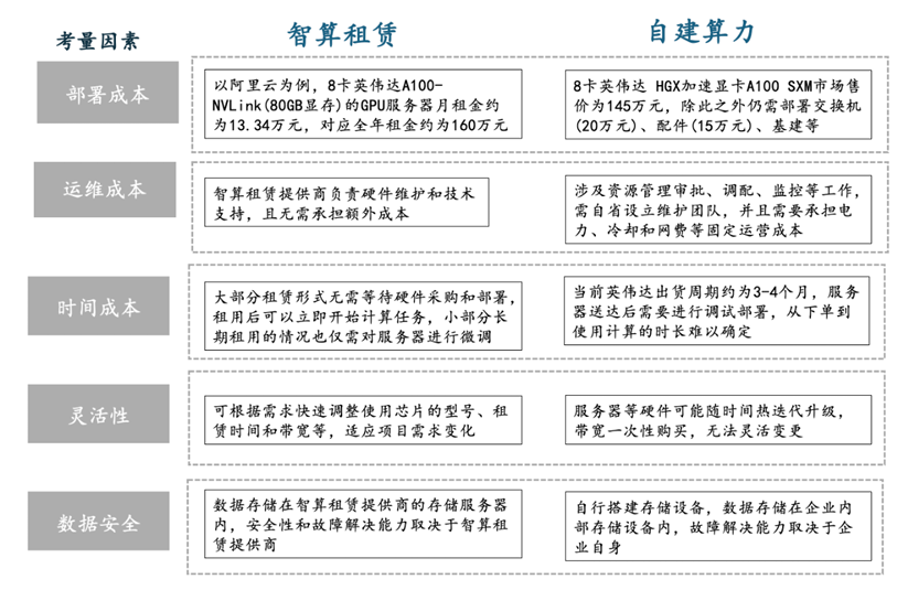 (2)算力租赁厂商的核心竞争力。互联网等客户对算力需求较大,单笔订单所需服务器数量较大,对供应商的供应能力有较强要求。如果不能按时交付,可能会有一定的处罚。强力的交付、上线和后续运营能力。AI算力服务器工作条件要求高,到货后需要调试、组网和调优,达到一定要求之后才能正常满足客户使用需求。同时,AI算力服务器上线运营之后,需要专业团队维护和运营。较快的交付、上线时间,较少的损耗和故障情况,可以显著提升业务流畅性、降低运营成本,提升盈利能力。资金周转能力。AI算力服务订单金额较大,上市公司需要各种融资方式来完成订单要求。惟有较强的资金周转能力,方能支持公司按时完成客户的订单交付以及上线运营。