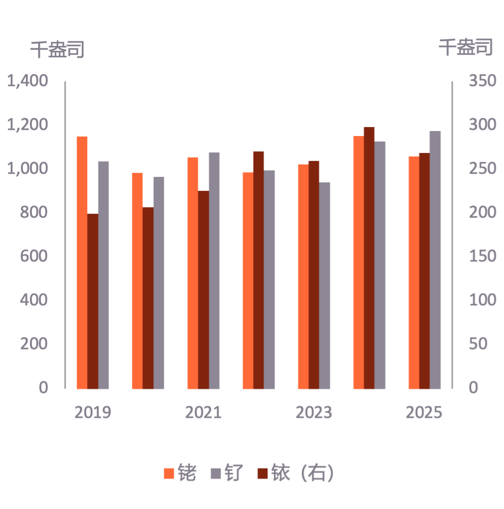 之前连续两年下降后,2024年钌需求量显著回升。来自AI应用的数据和处理需求不断上升推动电子产品产量强劲增长,叠加中国化工业需求上升,驱动钌需求量大幅回升。制氢过程中钌用量也在增长,包括在非绿氢重整工艺中的应用。