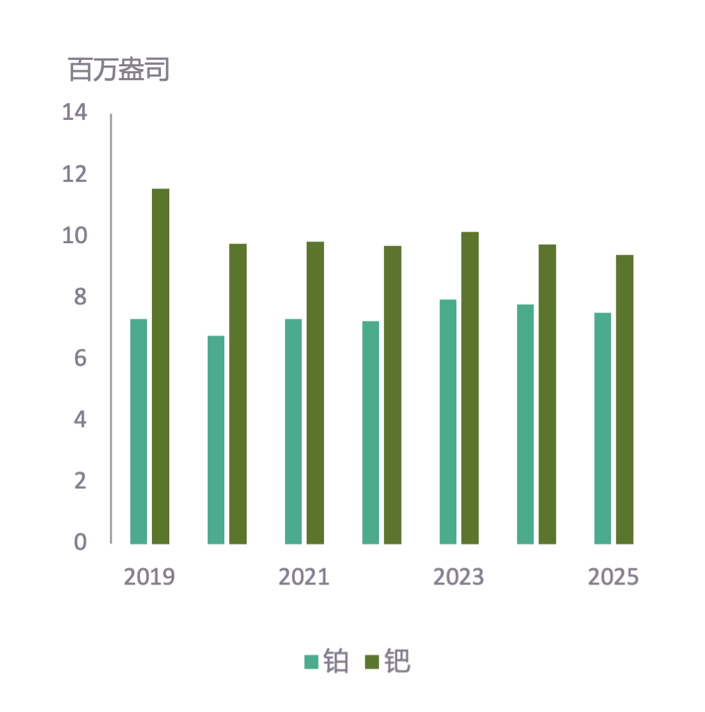 关税相关风险使铂族金属需求环境更具挑战性。不过由于2021年以来矿产铂族金属供应量和二级市场供应均持续下降,五种铂族金属的实物供应量将继续低于需求量。