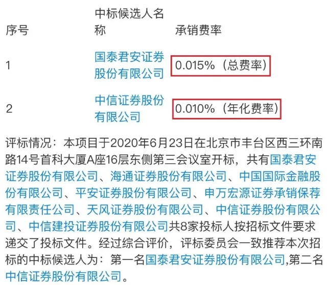6月24日,中核融资租赁公司债券承销项目公布中标候选结果,参与竞标的8家券商中,国泰君安和中信证券分别以第一和第二名进入了中标候选名单,承销费率分别为总费率0.015%和年化0.01%。也就是说,两家机构的承销费用仅几十万。