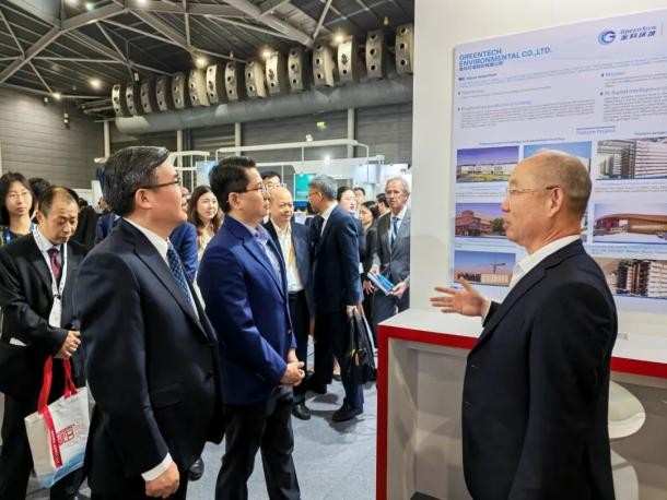 (图片:金科环境董事长张慧春正在向水利部副部长陈敏、新加坡永续发展与环境部常任秘书罗家良、水利部国际经济技术合作交流中心副主任胡文俊等重要嘉宾做介绍)
