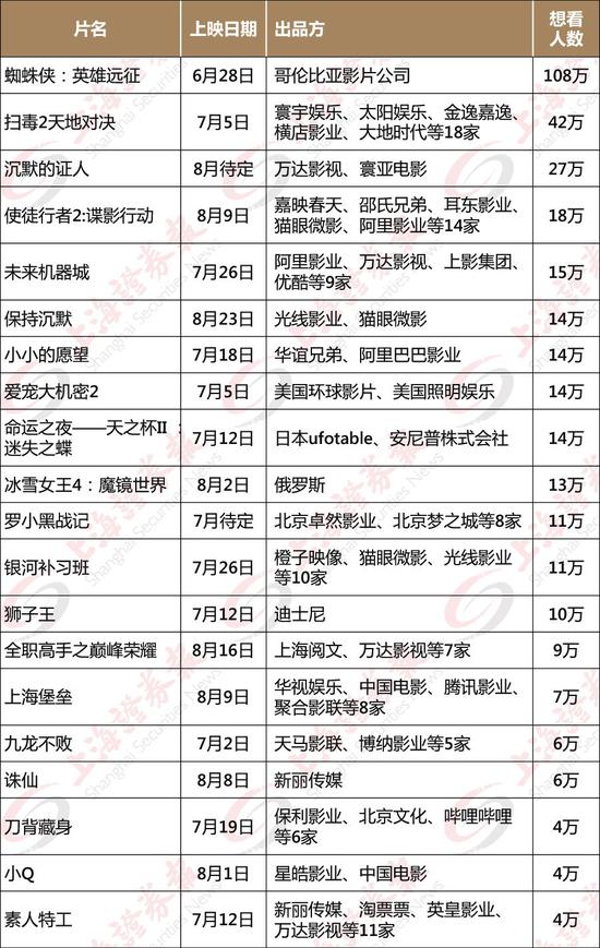 截至6月26日,根据灯塔平台的“想看人数”,《蜘蛛侠:英雄远征》《扫毒2》《沉默的证人》《使徒行者2》《未来机器城》《保持沉默》《小小的愿望》《银河补习班》《上海堡垒》等多部影片,受到极大关注。