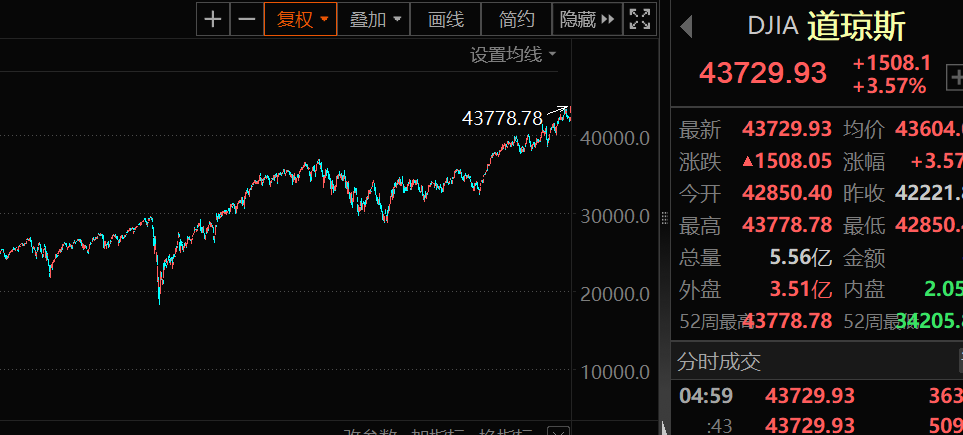 美国大选尘埃落定的首个交易日,主要股指均高开高走。道指大涨1500点,涨幅报3.57%;纳指涨2.95%,盘中首次突破19000点;标普500涨2.53%,三大指数均创历史新高。