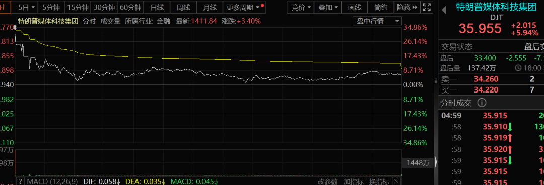 特朗普为第一股东的特朗普媒体科技集团盘前一度大涨超60%,开盘后因波动性短暂停牌,停牌前涨超24%,随后震荡回调,盘中又再度多次停牌,收盘涨幅缩水至5.94%。