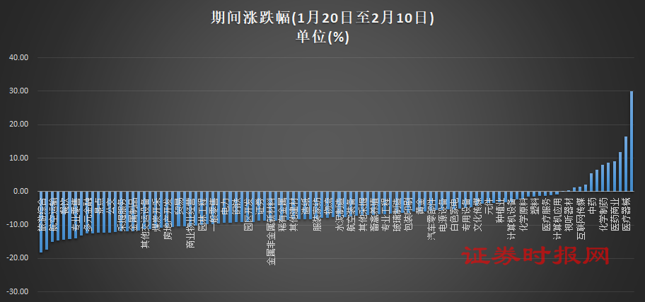 春节前后一段时间内,疫情持续发酵,A股市场围绕疫情受益板块持续展开。数据显示,自1月20日以来,截至2月10日,医药相关行业板块普遍上涨,医疗器械、医药商业、化学制药、中药等板块涨幅明显。与此同时,“宅经济”表现也比较突出,计算机(云办公)、互联网传媒(游戏)等超额收益也比较明显。