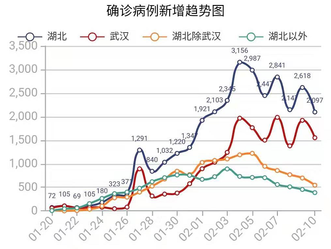 湖北除武汉新增确诊病例,从2月5日的1221例,降至2月10日的545例。