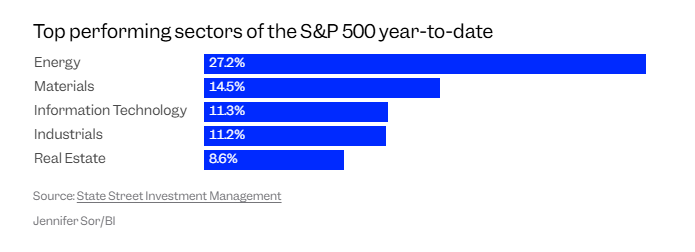 而事实上,市场其他板块已呈现更强劲的表现。虽然信息技术板块仍是市场表现最佳的板块之一,但其涨幅已被能源板块(今年迄今上涨27%)和材料板块(今年迄今上涨14%)超越。