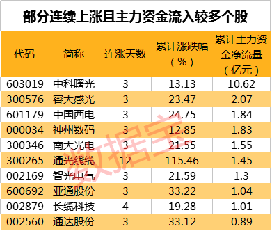 这些股连涨超过五日 中科曙光资金大幅流入