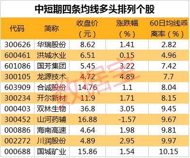 截至最新,56只个股5日、10日、20日、60日四条均线近日呈多头排列。其中华瑞股份、洪城水业、国芳集团股价与60日均线的乖离率最小,分别为2.82%、4.96%、7.42%。