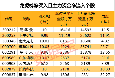速看!龙虎榜净买入且主力资金净流入个股一览